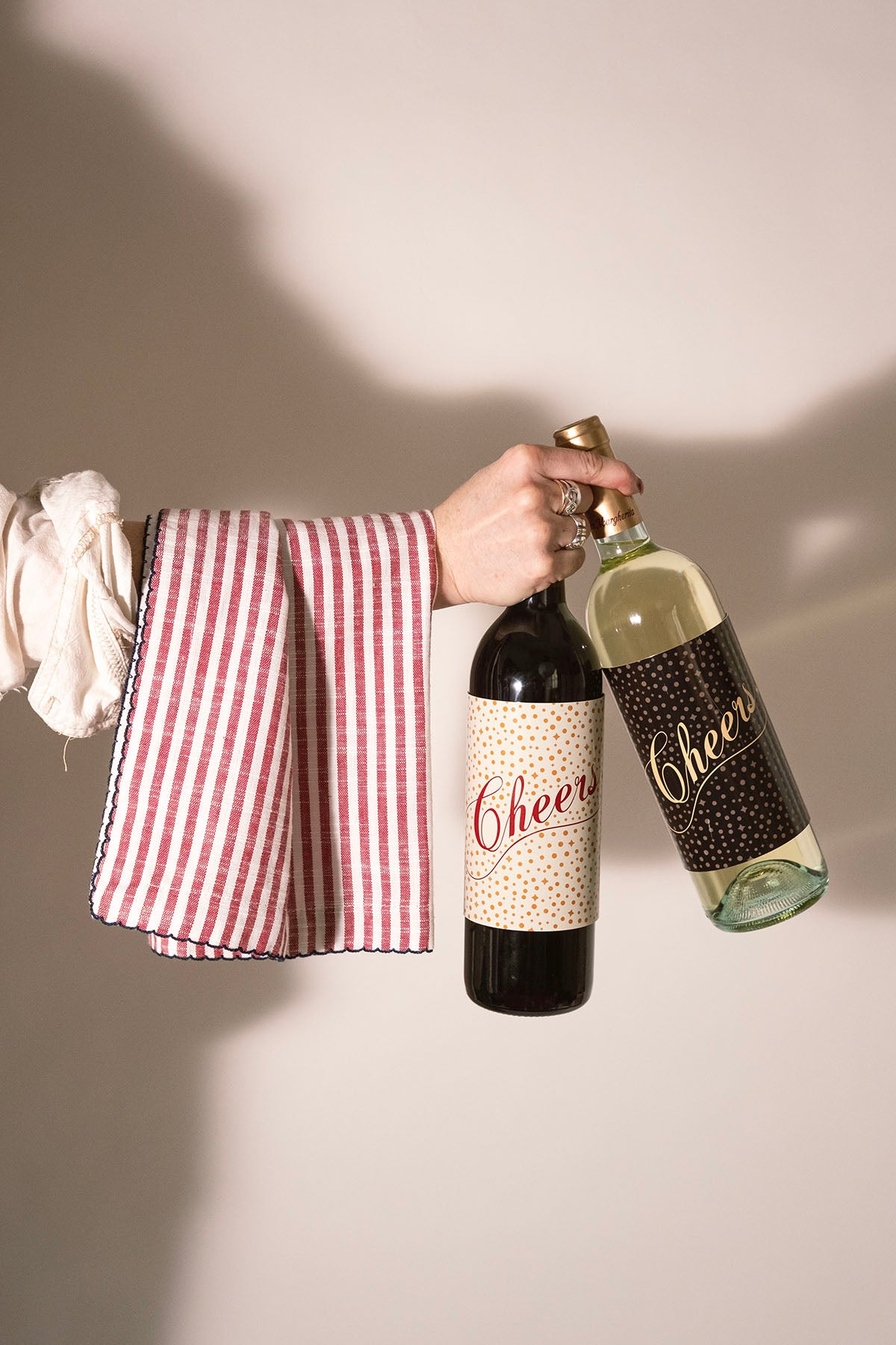 Celebrating or just to dress up the bottles in your kitchen, the Cheers! cuff will make any bottle sparkle. Available in Red/White and Black/Gold.